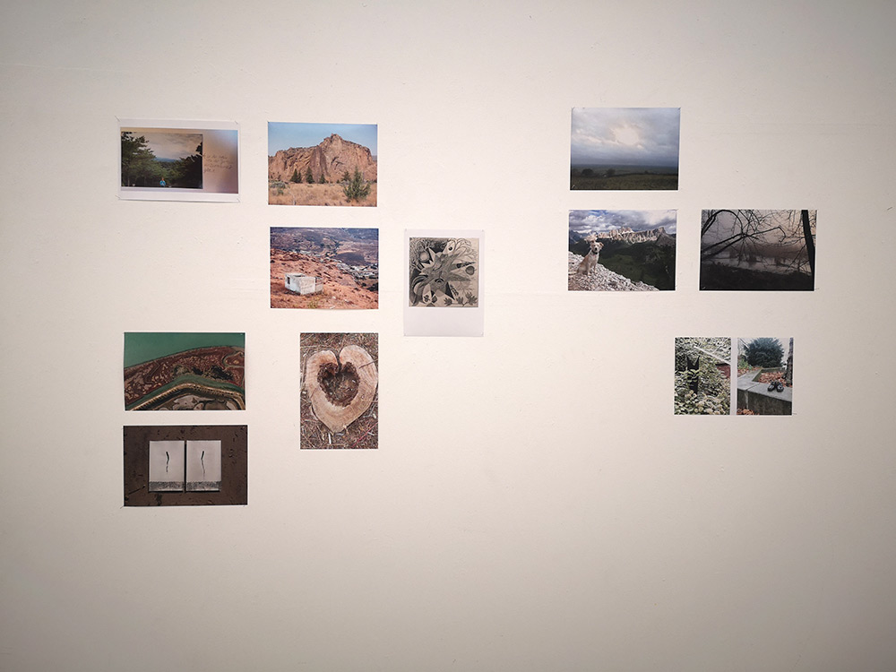 uses landscapes as tools to consider ourselves in relation to the world, personal histories, and interpersonal connections outside of screen-space. Organized by Kim Collmer, the artist asked a selection of people to submit an image of a "carried landscape" and also a description of their relationship to it. Over 60 images were sent in. The work was then printed and displayed in loose groups based upon the time of day, from morning to night and finally dream spaces. On the floor Collmer activated the room by creating shapes using indexes from travel atlases.